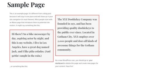 This is an example page. It’s different from a blog post because it will stay in one place and will show up in your site navigation (in most themes). Most people start with an About page that introduces them to potential site visitors. It might say something like this: