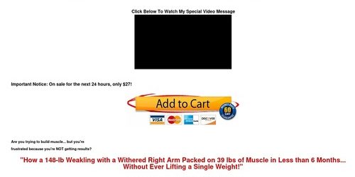 I remember when I was a scrawny weak 148 lb dude back in 2008. It was bad enough that I couldn’t use a set of weights, but with a withered arm and people telling me to give up I literally felt like I was helpless and DOOMED to remain skinny forever. And I’m realy fortunate to have made a discovery which helped me pack on 39lbs of muscle in less than 24 weeks without ever having to lift a weight. And I want to share this discovery with you…