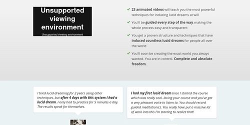 Well to be honest I was a little skeptical when I saw your add, but it seemed everything you said that your course provided was what I needed and everything you said about why people don’t lucid dream was what I was going thru. I have bought many lucid dreaming books and read everything that I can find on the internet trying to figure out what I was doing wrong. There were some really good books explaining techniques and how to do them but I think they really never explained exactly how to do them and some mistakes people make. I am just getting started going thru your course and how you explain to do reality checks and when do them so far is the best I have read. Plus how you explain a lot of mistakes people make when they do them is exactly what I have been doing. So far I am impressed with the content and how the animation works, it is unique and not sure if that is your voice but the voice keeps my attention and just seems to give you confidence when you listen to it. I have bought books on the subject, but this is the most money I have spent on a product. It took a lot for me to purchase something when there is so much for free on the internet, but once you get a taste of how fantastic lucid dreaming is you want it, and I am just at the frustration point that I am lucky if it happens once a month. I was willing to spend some money, and made it my new years resolution to lucid dream once a week. You see so many fake ads that promise you everything but its just the same old thing you can get for free and you get mad you spent the money. You priced it at a price that I felt I could take a chance on it and the money back guarantee was nice too. So far I am very pleased and I am not even half way thru and I feel I have already got my moneys worth.
