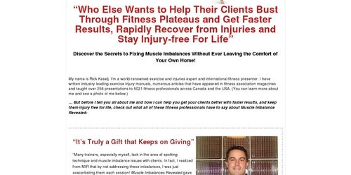 P.S. â There is NO RISK at all for you when you try Muscle Imbalances Revealed. If you are not thrilled with how this system helps your clients overcome injuries, bust through fitness plateaus or prevent injures, I insist you contact me to get your money back. Your satisfaction is 100% guaranteed. Rick Kaselj has been trusted by the largest fitness & rehabilitation associations in Canada and the USA (NSCA, ACE, NASM, CanFitPro, BCRPA, CKA, NHPC).