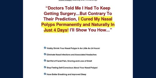 I did not know this when I was first diagnosed with nasal polyps but now I know better. And I have put all my research and knowledge into an extremely easy-to-follow 45+ page guide that will tell you exactly how to cure yourself of nasal polyps permanently and safely. This is the same system that has worked for myself and for thousands of other nasal polyps sufferers, and I am confident that you too will be successful in eliminating your nasal polyps for good: