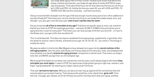 My years as editor-in-chief at Iron Man Magazine have allowed me to peer into the secret routines of the anti-aging experts. Over the years, both Becky and I have picked up SO many tips, tricks, and strategies that have allowed us to literally reverse the aging process, at least from a cellular level. That means our body’s look, feel, and MOVE younger than our chronological age.
